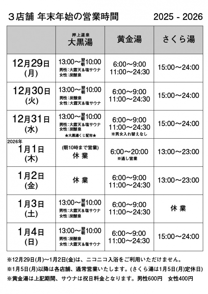 押上温泉 大黒湯・黄金湯・さくら湯の年末年始の営業スケジュールです。