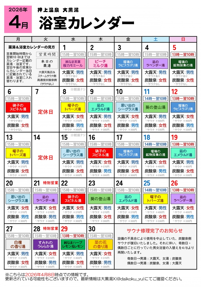 2026年4月の薬湯予定表が完成しました。皆様のご来店を心よりお待ちいたしております!