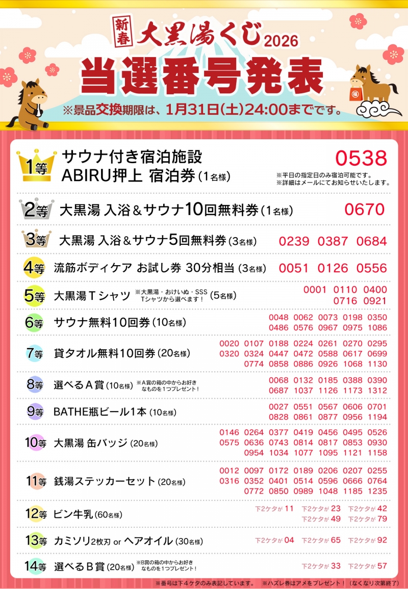 ★★★大黒湯くじ2026 当選番号発表!★★★